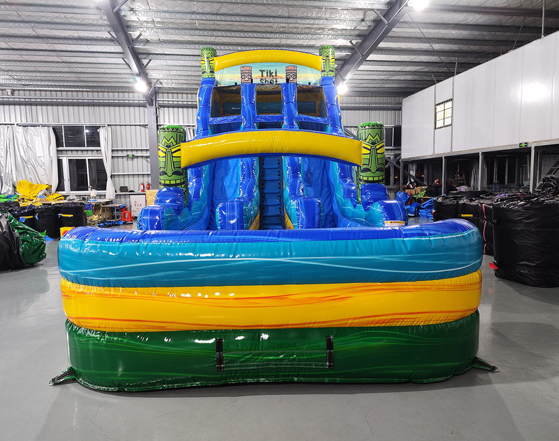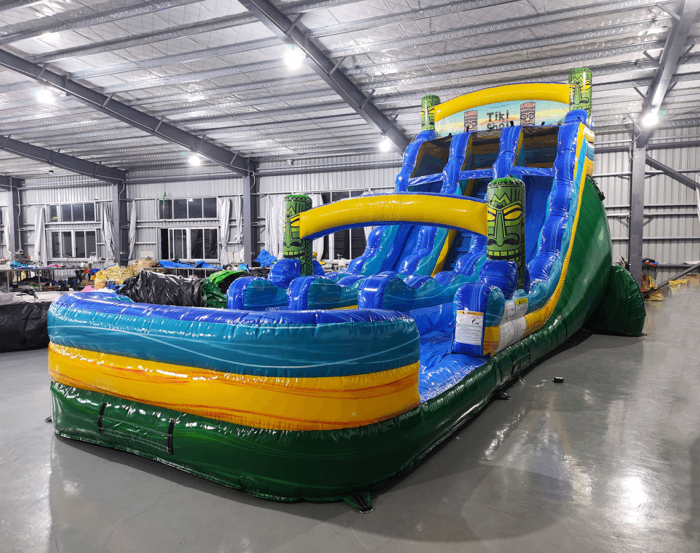 This slide has a marble green, yellow, and teal color scheme with 3D Tiki heads and banner. The water slide is dual-lane and has a large pool at the bottom. Slide can either be wet/dry.