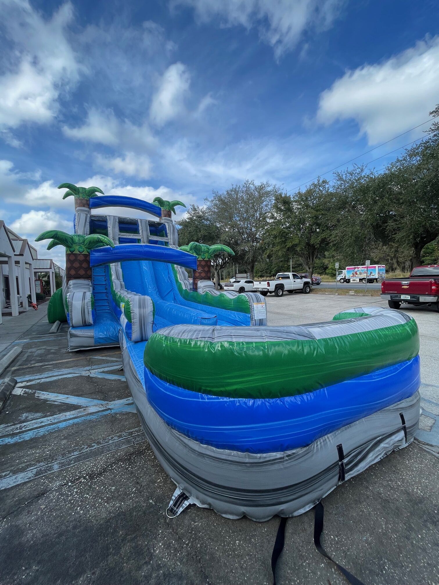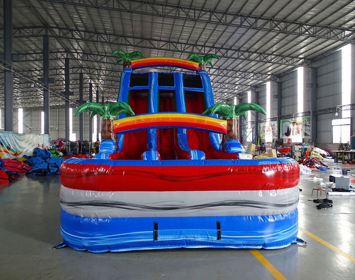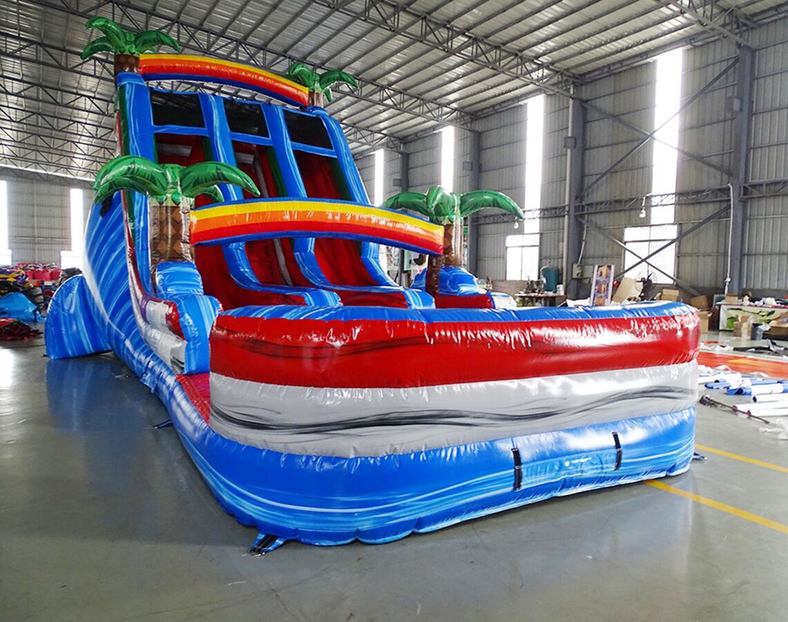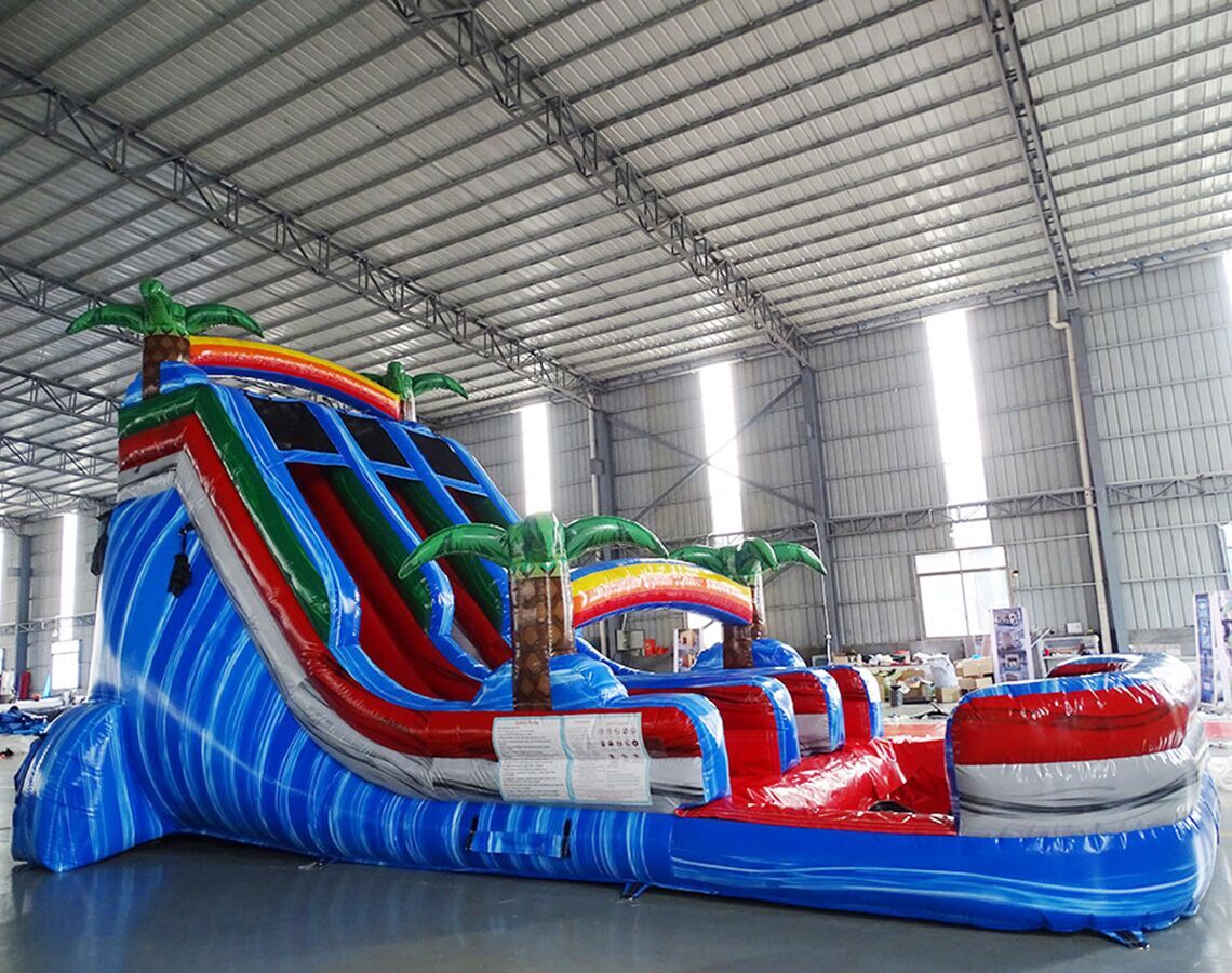 This slide has a marble blue, grey, and red color with 3D Palm Trees. The slide is dual- lane and has a large pool at the bottom. Slide can either be wet/dry.