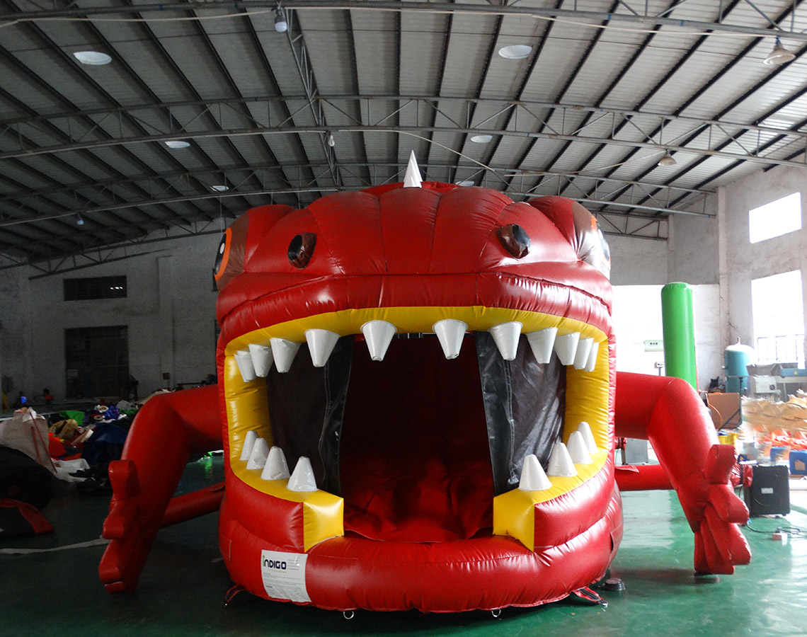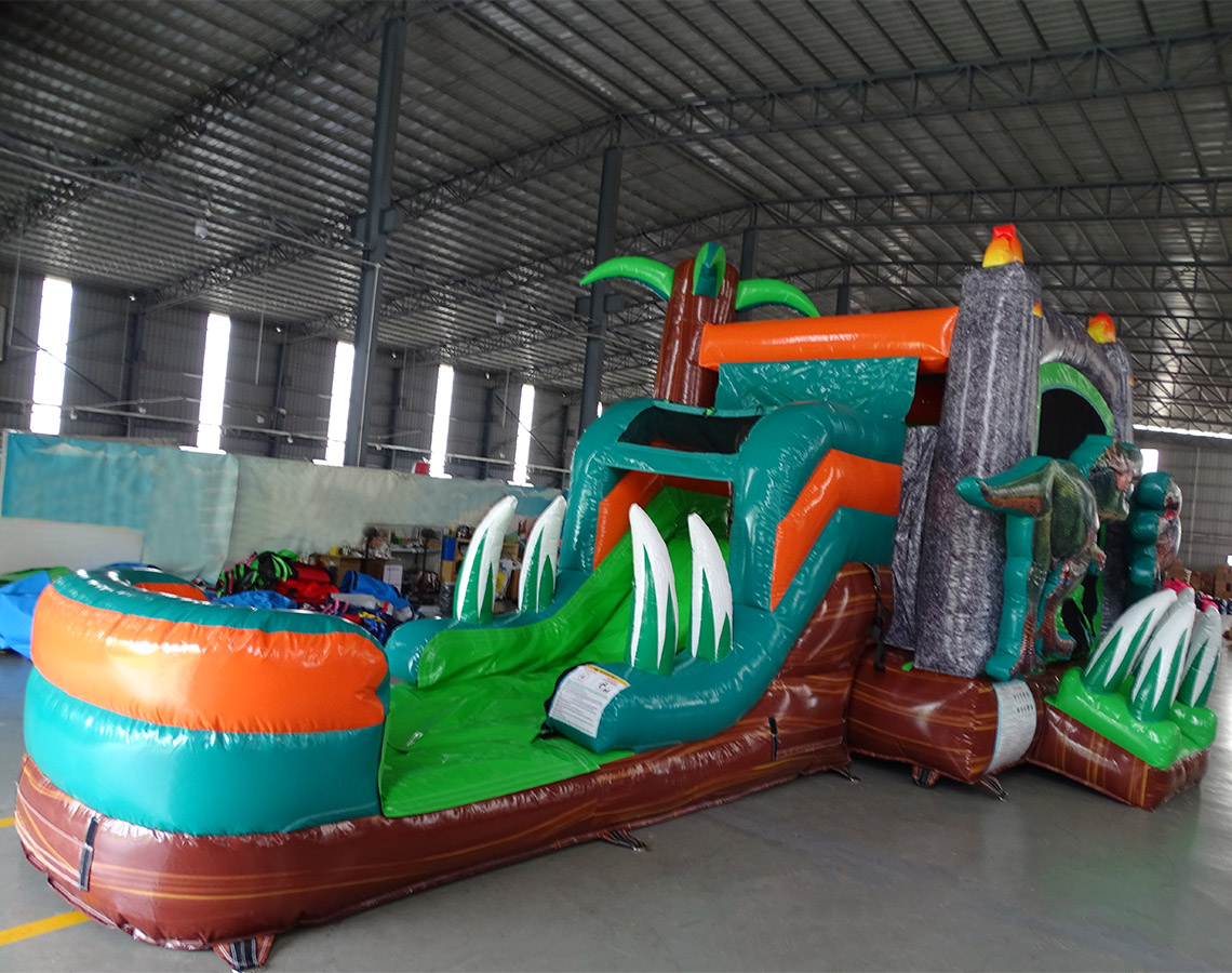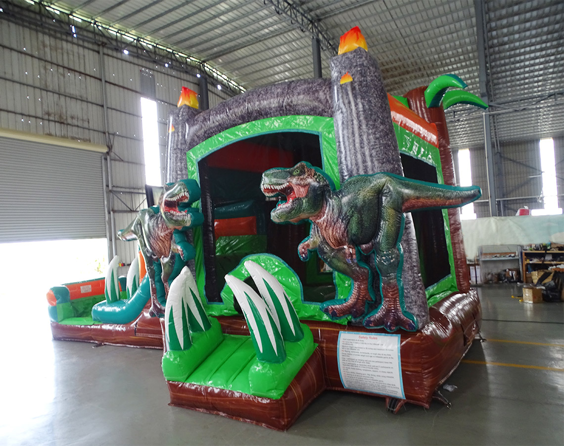 This combo includes a dinosaur theme with 3D dino fixtures and a splash pad. Roof includes emergency exit. Slide can be wet/dry.