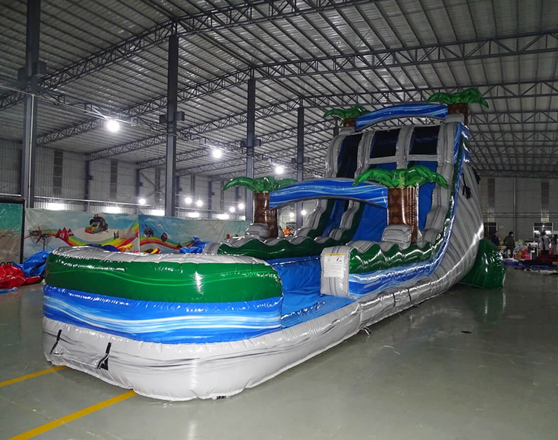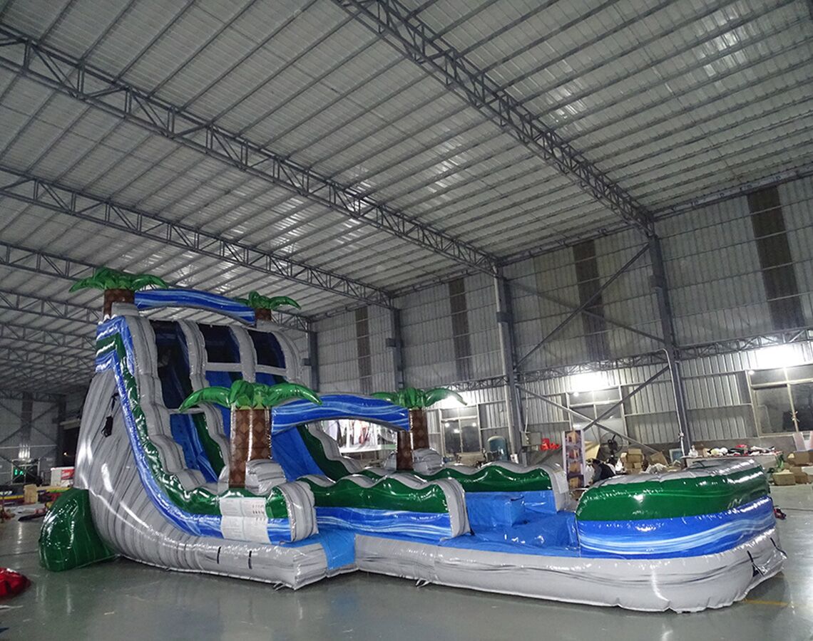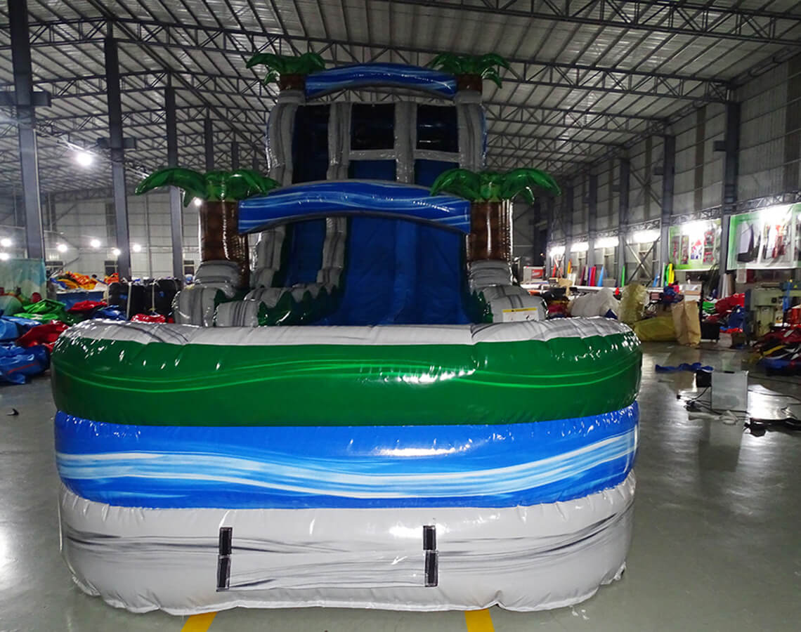 This slide has a marble grey, blue and green color scheme with 3D palm trees. The water slide is dual-lane and has a large pool at the bottom.